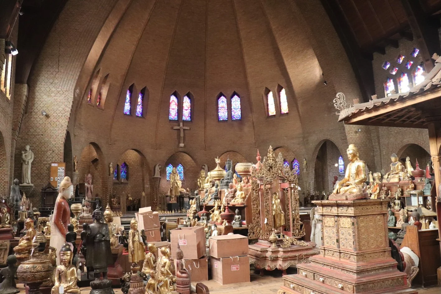 My encounter with the Original Buddhas collection is largely coincidental. In the summer of 2024, while in Amsterdam for a pre-conference workshop at the University of Amsterdam, I was exploring important private collections of Asian Buddhist art in the Netherlands. I had already visited some prominent private galleries of Buddhist art in the heart of Amsterdam like the Astamangala Gallerie in Keizersgracht, when I came across Original Buddhas as a very eccentric and exceptional collection, and also very symbolically housed in a now-defunct and repurposed Christian church in the Dutch town of Deventer, a few kilometres east of Amsterdam. The building in which the collection is housed bears a striking semblance to The Tibet Museum of the Fondation Alain Bordier in Gruyères, Switzerland, established in 2009. Both institutions – one a commercial dealership, the other a museum – are housed in repurposed Christian spaces, highlighting a broader trend in Western Europe where deconsecrated churches are repurposed or adapted for new purposes. While many such structures are converted into boutique hotels or non-religious venues, some exceptions like Original Buddhas uniquely preserve their spiritual undertones by hosting objects of religious reverence from non-Western traditions. The Johannes Vianneykerk in Rielerweg, Deventer, housing Original Buddhas, was acquired and repurposed by its founder Peter in 2016, and offers a striking juxtaposition of Christian and Buddhist aesthetics. It is located on the Rielerweg and named after Johannes Maria Vianney (1786-1859), the Catholic patron saint of parish priests, who was canonised in 1925. Until 2014 it was used by the Roman Catholic parish of the same name. The building of the church dates from 1929 and was included in the register of national monuments of the Netherlands in 1999. It was designed by a local architect Martin A. Roebbers, who designed it in the form of a basilica. The church has three naves under a saddle roof with a roof turret. The altar is relatively shallow compared to other early twentieth century Dutch churches. The geometric figure of the parabola was used extensively for the sober expressionist design in clean brickwork. The church was built on the site of the Kolk van Zandvoort, which was once created by a dyke breach in the IJssel. After the Kolk was filled in, concrete piles were driven to form the foundations of the building because of the peaty subsoil. Originally, a tower was planned to be built next to the church; this did not happen due to the Dutch economic crisis of the ‘thirties. At the end of 2013, the newly formed merged parish for Deventer and the surrounding area was ordered by the diocese to close the church, together with four others, necessitated by the decline in the number of church members and the reduced participation of parishioners in church life. On 2 February 2014, the last regular celebration was held in the church, and on 29 June 2014, the last Holy Mass was celebrated to mark the closure, following which the church building was officially withdrawn from worship by the bishop. In the search for possibilities for repurposing, the parish board called in experts as well as students from Saxion University, Enschnede. In 2016, the Vianney Church became the property of Peter Vredeveld, a dealer in Buddha statues and Asian art. The zoning plan of the town of Deventer had to be adjusted to allow for an art gallery in the church. With respect for the monumental value of the building, a gallery for Asian art was also planned to be established there. However as of March 2025, this is yet to be fulfilled.