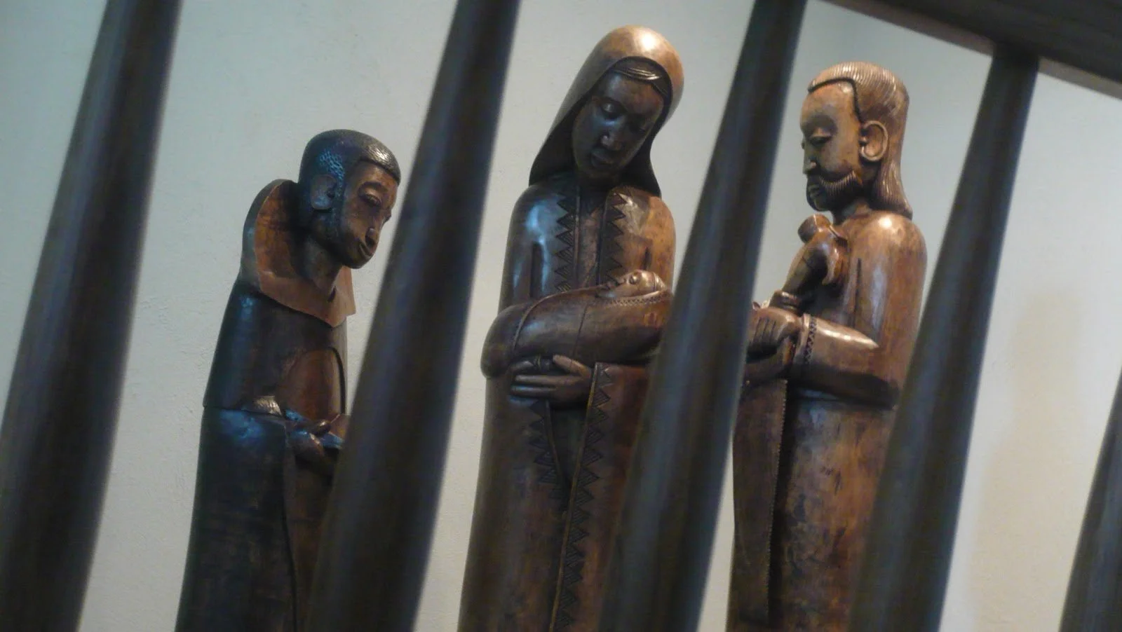 Butler’s sculpture of St Martin and the Beggar was made in 1951 when he was a student at St Martin’s School of Art. Chikerema’s sculptures of the Holy Family come from the school associated with the Driefontein Mission near Masvingo in Zimbabwe established by the Swiss Bethlehem Fathers. Chapman’s image of the Christ-child is carved in a 4.5 tonne block of Portland Stone which is now permanently on display at the entrance to the church. The opening text from the Gospel of John is inscribed around Chapman’s sculpture: "In the beginning was the word and the word became flesh and lived among us." Stephenson’s sculpture was inspired by photographer Sam Nzima's iconic picture of the shooting of teenager Hector Pieterson in Soweto in 1976 and reflected the way in which the steps of St Martin’s became a place of vigil against apartheid.